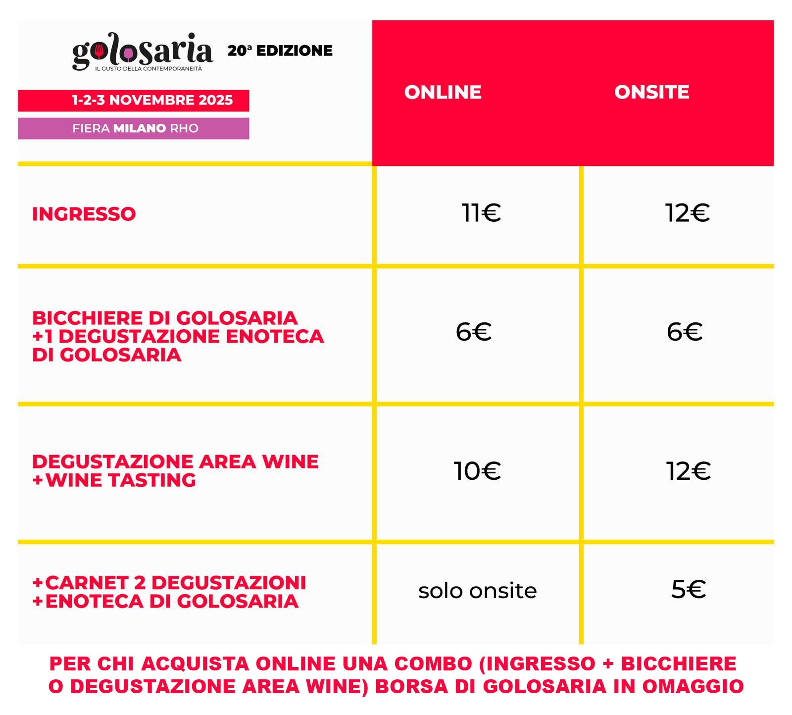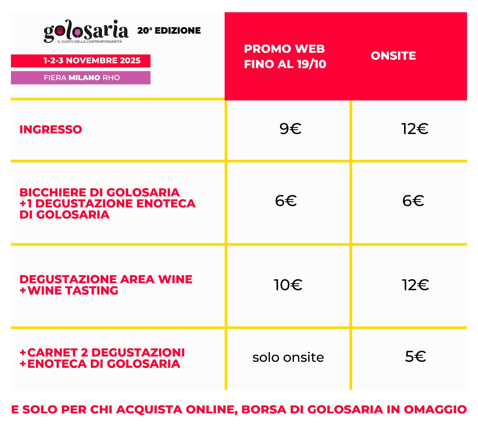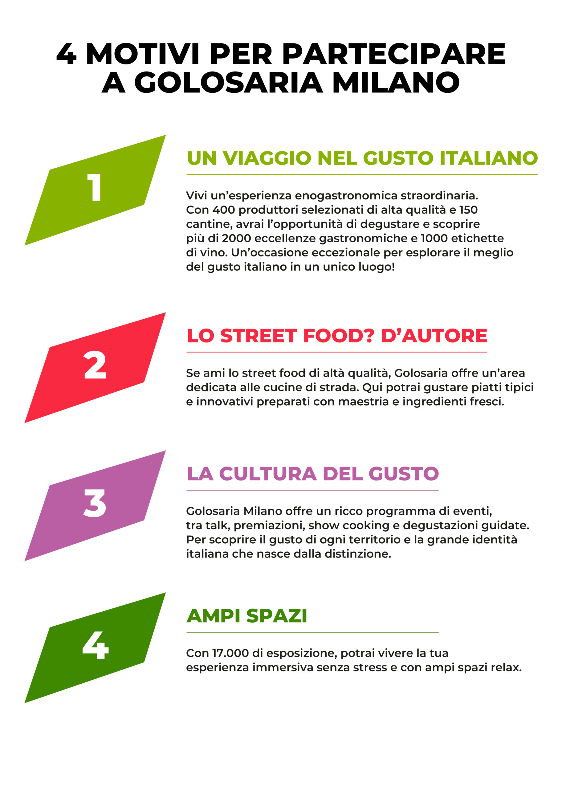 Non perdere l’opportunità di partecipare a Golosaria Milano. Unisciti a noi per tre giornate di scoperta, connessione e successo nel mondo del food & wine. Golosaria Milano è l’evento ideale per promuovere i tuoi prodotti e far conoscere la tua azienda a un pubblico appassionato e qualificato, composto da professionisti del settore e consumer attenti.